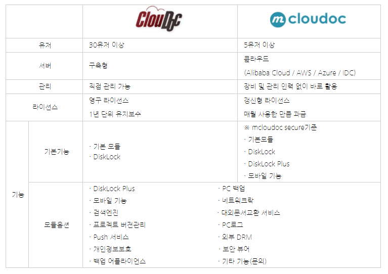 문서중앙화 문의가 들어오면 고객의 니즈와 기업 규모, 환경 등을 파악하고 cloudoc과 mcloudoc을 제안합니다. ClouDoc과 mcloudoc이 제공하는 기능은 동일하지만 지원하는 유저 수와 서버가 다르고 라이선스의 종류도 다릅니다.