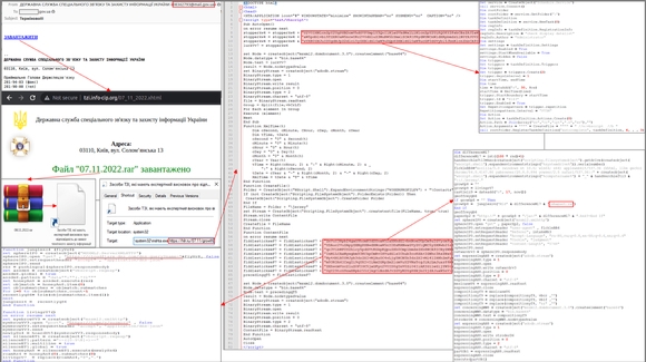 CERT-UA는 “링크를 클릭하면 자바스트립트(JavaScript) 코드가 포함된 HTML 파일이 다운로드되고 피해자 컴퓨터에 RAR 아카이브(archive)가 생성된다”며 “예를 들자면 ‘08.11.2022.rar’ 형태”라고 전했습니다.