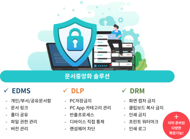 문서중앙화 솔루션 클라우독은 사내 모든 문서를 중앙화하여 DLP, DRM 등과 같은 각종 보안 기능으로 안전하게 정보를 관리합니다. 유출의 위협에 노출된 도면 설계 자료, 프로그램 소스코드와 같은 핵심 기술문서를 암호화하여 중앙문서함에 안전하게 보관하고, 허용되지 않은 입출력을 완벽히 통제하여 빈틈없는 기업 자산화를 실현시킵니다.