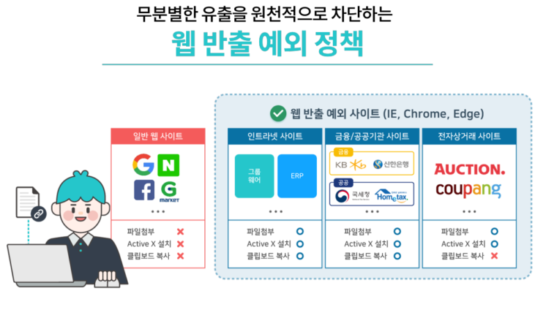 ClouDoc은 일반적인 웹사이트에 대해 최상의 보안정책을 적용하여 외부 유출을 원천적으로 차단하고, 문서보안등급 기능은 문서관리에 대한 새로운 관리 방식을 제시합니다. 기존에 사용하던 문서함 체계는 그대로 유지하면서 부서, 직급, 직원에 대한 세부적인 분서 취급권한을 적용하고 구체적이고 세밀한 문서 관리를 통해 업무의 효율성을 극대화 시켜 정보 유출을 원천적으로 차단합니다. 다만, 업무용 인트라넷, 공공기관 등 업무상 필요한 사이트에 대해서는 일부 작업 허용이 가능합니다.