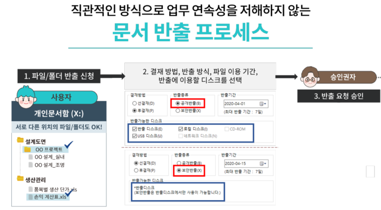 분출 프로세스로 불필요한 문서 반출을 방지하며, 공개/보안 반출 방식에 따라 반출 가능 디스크가 달라지는 등 목적에 맞는 반출 프로세스를 설정해 유연하게 공유할 수 있습니다.
