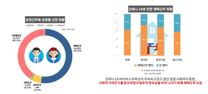 코로나 19 감염증의 확산이 지속되고 있고 여전히 사회적 거리두기를 진행중이나 최근까지도 집단감염 사례가 발생하고 있습니다. 이에 기업들은 사회적 거리두기를 준수하면서 업무의 연속성을 이어 가기 위해 재택근무를 도입하는 추세입니다. 스마트폰, 태블릿 등 각종 스마트기기가 생활 속으로 들어오면서 회사에 출근하지 않아도 업무 수행이 가능하고, 일하는 시간과 공간에 제약이 없는 유연 근무를 통해 업무생산성을 향상시켜 기업의 경쟁력을 키울 수 있기 때문입니다.