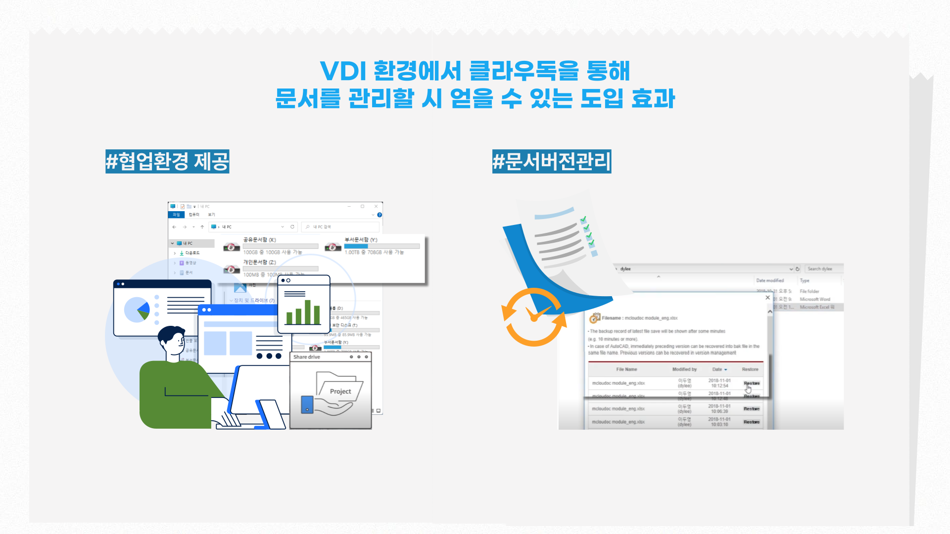 가상 데스크탑 환경(VDI)을 도입하셨나요? 문서는 어디에 저장하시나요? Window 파일 서버? 아니면 네트워크 스토리지와 같은 곳에 보통 문서를 저장하게 됩니다. 같은 VDI 환경에서도 클라우독을 통해 문서를 저장하고 관리한다면 어떤 효과가 있을까요?