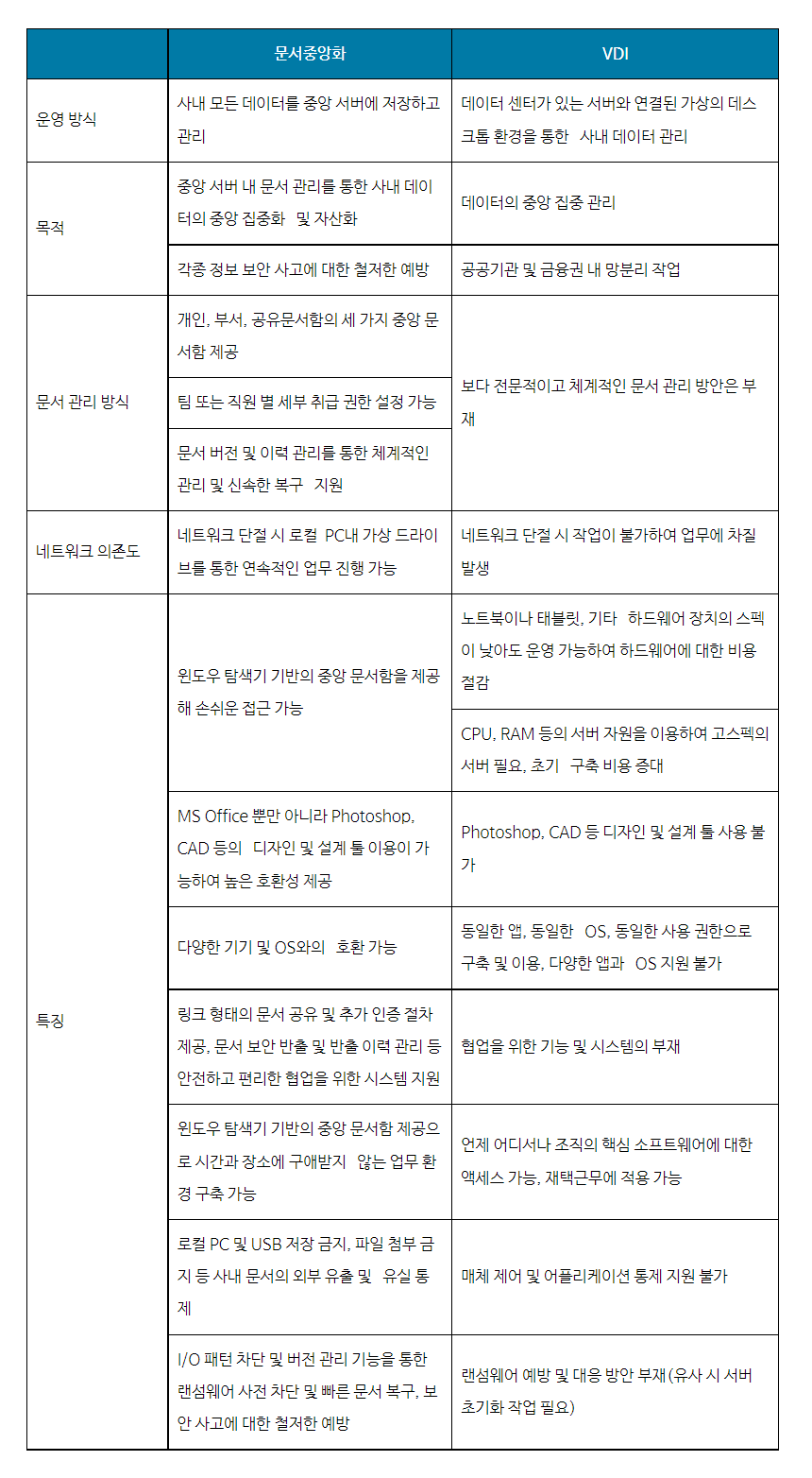 문서중앙화와 VDI의 개념에 대해 알아보았다면, 시스템의 운영 방식, 목적, 특징 등에 대해 본격적으로 비교해 봅시다.