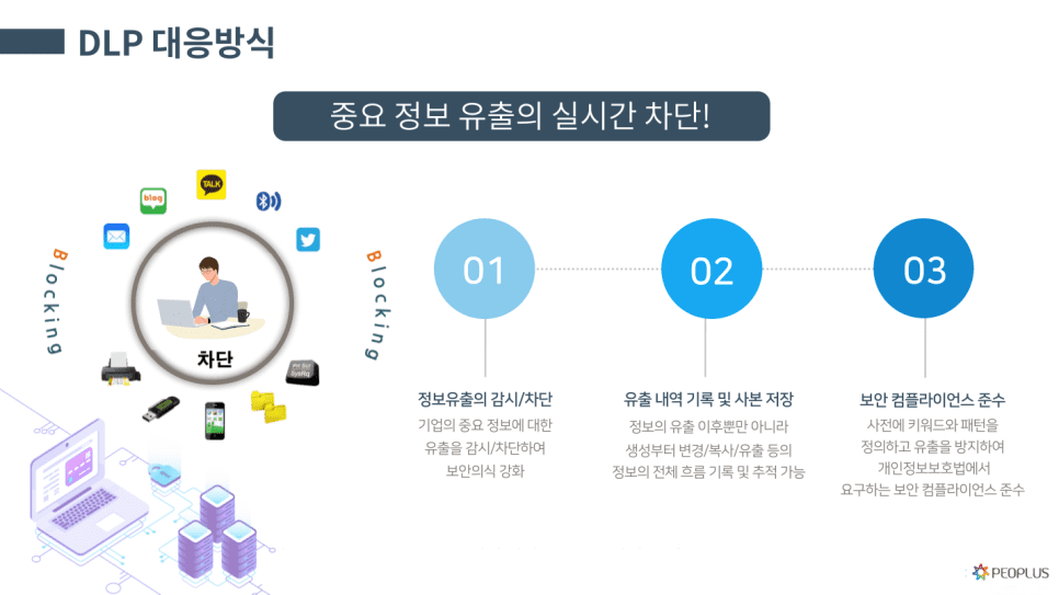 l 대표적으로 USB나 외장하드를 통한 파일 복사, 출력, 인터넷 파일전송을 통해 발생하기 때문에 정책이상의 기밀/개인정보가 포함된 파일을 외부로 반출되는 경우 모두 기록하는 방식으로 운영