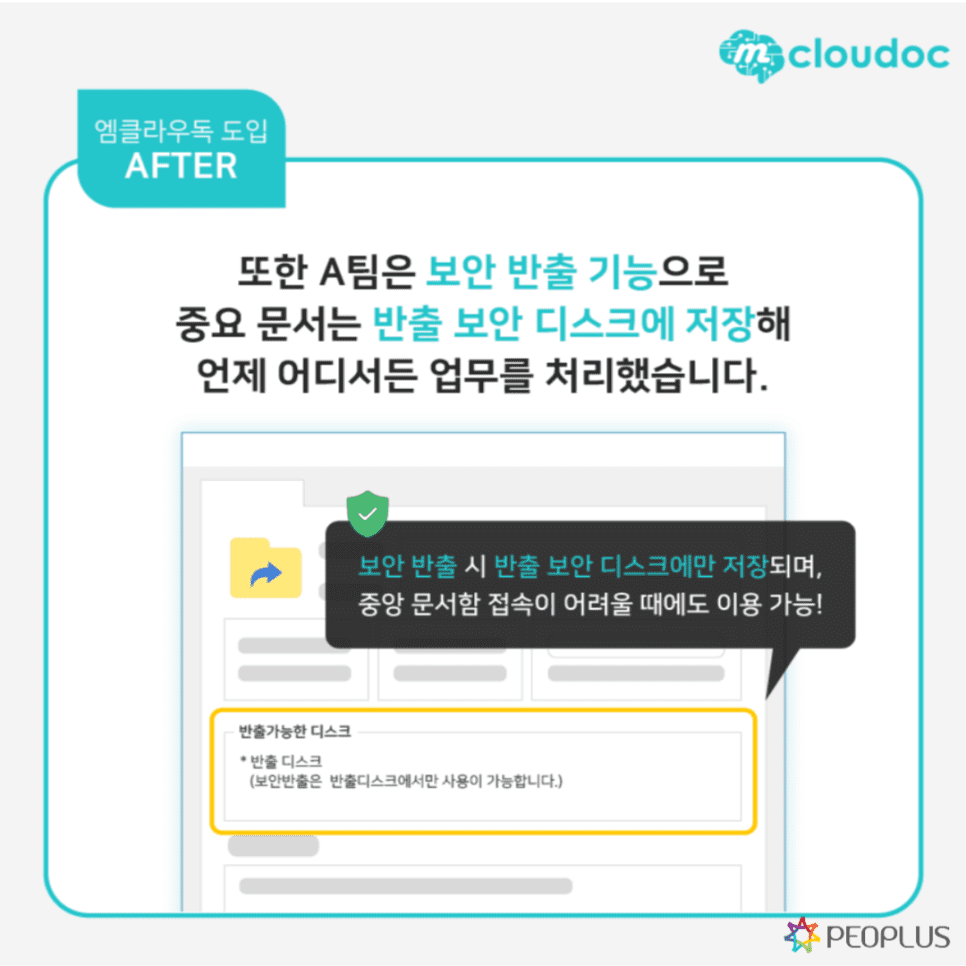 문서중앙화 클라우독은 업무로부터 파생된 모든 데이터를 중앙에 강제 저장할 수 있는 기능을 통해 모든 문서의 중앙화로 빈틈없는 기업 자산화를 실현할 수 있습니다. SSL VPN 및 Proxy 서버를 통해 재택 및 외부 업무 환경을 제공하는데 윈도우 탐색기 기반 운영체제를 제공함으로써 사용자의 업무환경 변화를 최소화 시킵니다. SSL VPN 암호화 통신을 통해 ClouDoc에 안전하게 접속하여 재택근무를 할 수 있고, 재택 근무 시 정책을 따로 두어 보안에 강점을 살릴 수 있습니다.