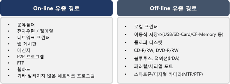잠깐 짚고 넘어가자면, ‘유출’이란 정보가 PC 내에서 벗어나는 모든 상황을 말합니다. 이동식 디스크에 정보를 옮기는 것, 프린터를 통한 인쇄, 메일이나 메신저에 파일을 첨부하는 것뿐만 아니라 웹 상에서 텍스트로 직접 작성하는 컨텐츠 등 범위가 아주 넓습니다. GRADIUS DLP의 경우 유출 경로를 온라인과 오프라인으로 구분하여 체계적으로 관리 및 차단합니다.