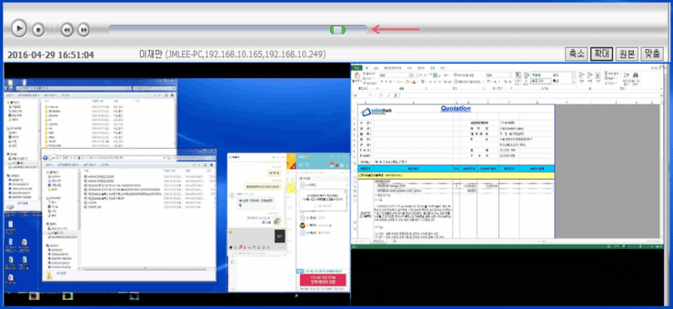 카카오톡을 사용하는 동안 영상으로 기록을 감기는 것도 가능합니다. GRADIUS DLP 녹화 기능은 사전에 녹화하고자 하는 상황을 설정하면 자동으로 동영상 녹화가 시작됩니다. 만약 ‘카카오톡이 실행될 경우’를 조건으로 설정할 경우, 카카오톡이 실행될 때 마다 사용자 PC를 녹화하여 어떤 정보가 유출되는지 기록이 가능합니다.