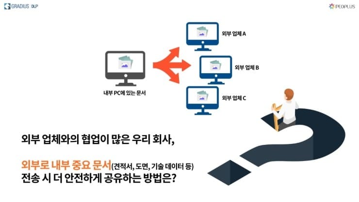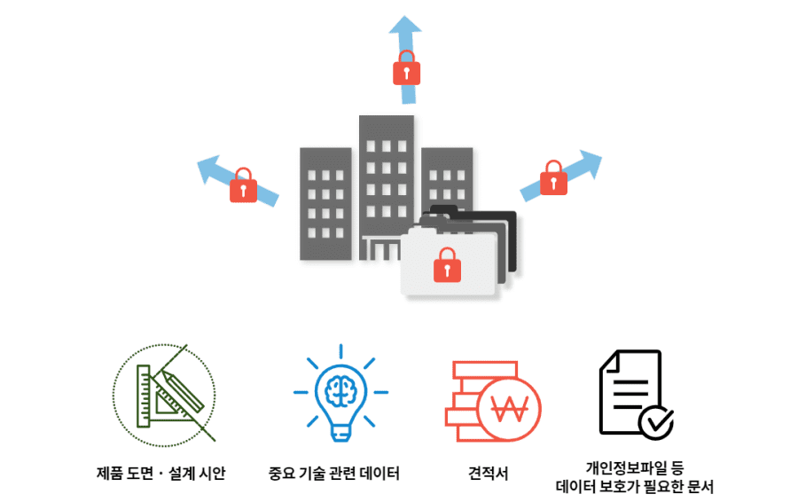 대부분의 기업은 내부에서만 업무를 진행하지 않고, 협력사나 고객사 등 외부 업체와도 협력하여 업무를 진행합니다. 이 때 외부 업체와 견적서나 기술 정보가 담긴 파일, 그 외 중요한 데이터가 담긴 문서를 공유해야 할 상황이 자주 발생합니다. 만약 이렇게 외부 담당자에게 공유한 중요 파일이 전달받은 담당자의 부주의로 인해 유출되었을 때 파일 보호가 되어있지 않았다면 2차 피해로 이어질 수 있습니다. 기업은 이러한 상황을 대비해서 어떤 보안 솔루션을 도입하는 것이 좋을까요?