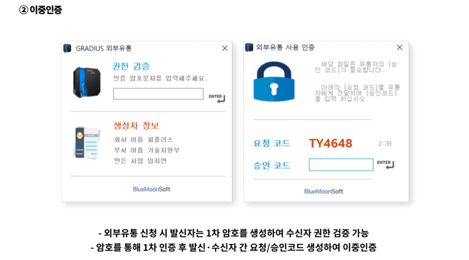 GRADIUS DLP는 외부유통 모듈을 추가하여 협업이나 기타 상황으로 인해 중요 파일을 외부 업체에 전송할 시, 파일을 암호화하여 전달할 수 있습니다. 예상치 못한 경로로 파일이 유출되어 재배포되는 상황을 막을 수 있으며 처음 외부로 전송되는 파일 경로가 로그에 기록되기 때문에 책임자를 색출할 수 있고 안전한 파일 공유가 가능합니다. 또한 파일 수신자와 발신자간의 이중인증으로 더 안전한 협업을 진행합니다.