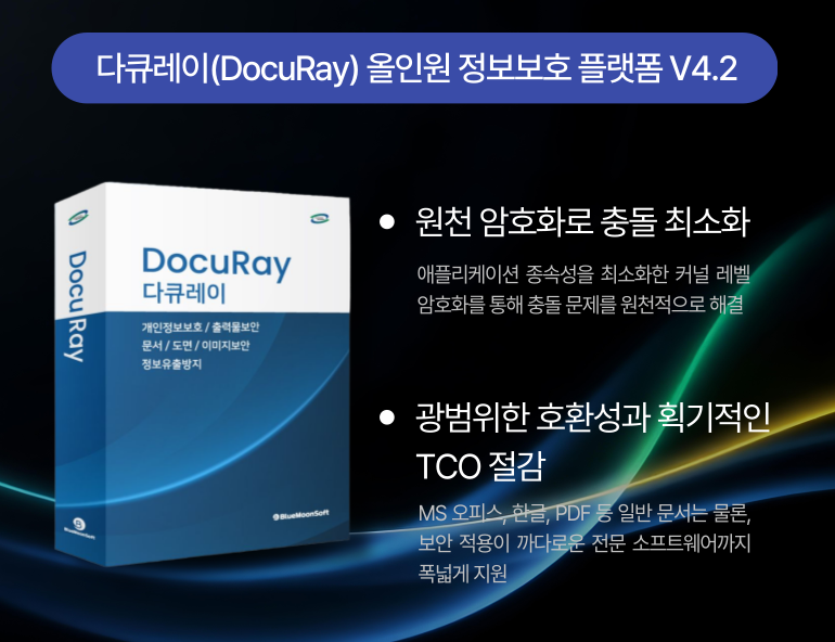 기업의 중요 데이터가 문서와 이미지를 넘어 2D/3D 도면, 소스코드 등으로 다양해지면서, 이를 통합적으로 보호할 수 있는 플랫폼의 필요성이 대두되고 있다. 블루문소프트의 ‘다큐레이(DocuRay) 올인원 정보보호 플랫폼 V4.2’는 이러한 시장의 요구에 최적화된 클라우드 기반 통합 보안 솔루션이다. 문서 자동 암복호화(DRM)를 핵심으로 정보 유출 방지(DLP), 랜섬웨어 차단, 출력물 워터마크, 보안 문서 반출 등 기업 데이터 보호에 필요한 모든 기능을 하나의 플랫폼에서 제공한다. 문서중앙화, VDI, 망분리 환경에서 파일이 외부로 반출되는 순간 평문으로 저장되어 보안 공백이 발생하는 한계를 다큐레이는 파일 자체를 암호화하는 방식으로 보완한다.