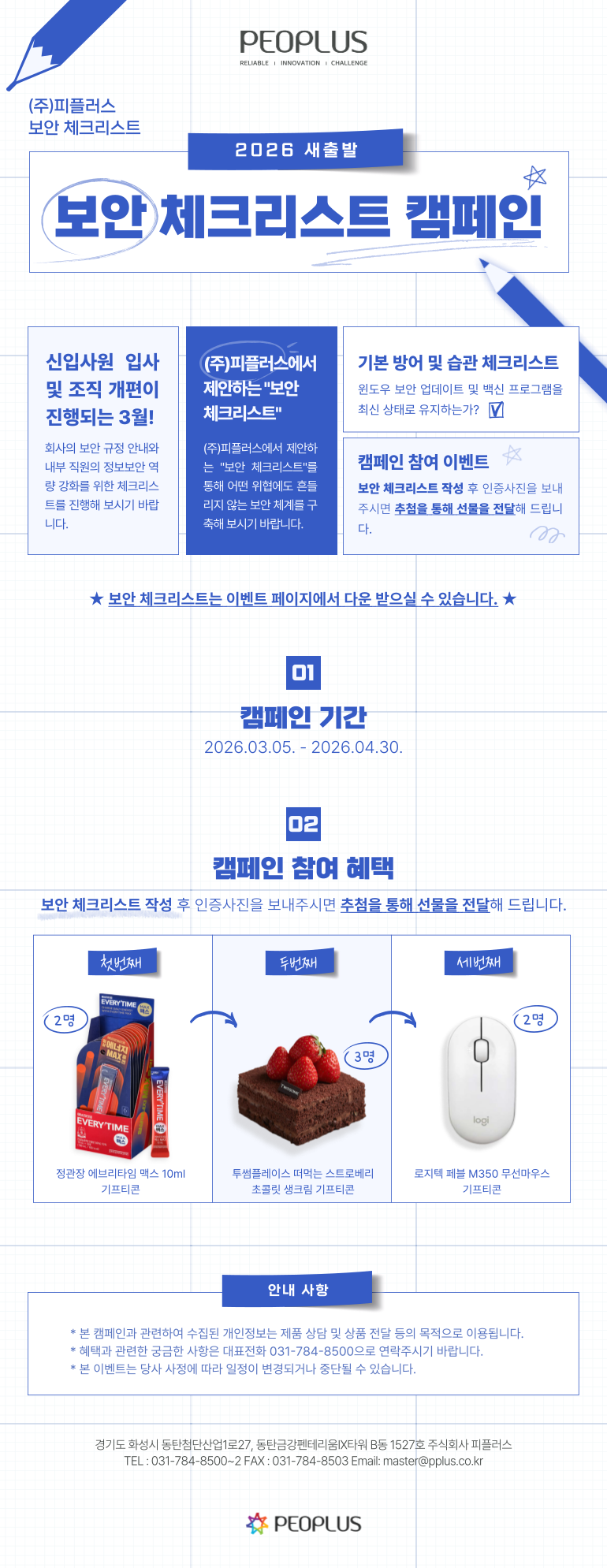 2026 “새출발 보안 체크리스트” 캠페인 ★ (주)피플러스의 “보안 체크리스트”를 통해 기업의 보안 현황을 체크해 보시기 바랍니다. ★ (주)피플러스 “보안 체크리스트” 파일 다운로드 위 내용에 동의합니다Choose FileThank you for your message. It has been sent.×There was an error trying to send your message. Please try again later.×Submit제품에 대해 궁금한 점이 있으신가요? 빠르고 정확한 답변을 도와드리겠습니다.상담 · 문의하기TEL : 031-784-8500~1 E-mail : sales@pplus.co.kr peoplus2026-03-03T15:19:00+09:003월 3rd, 2026|