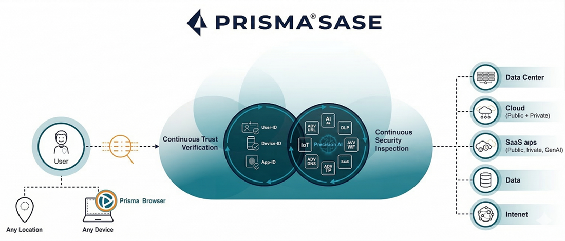 기존 방식이 위치에 따라 서로 다른 정책(IP/Port 기반)을 사용하는 것과 달리, Prisma SASE는 전 세계 어디서나 단일 통합 정책을 유지하여 복잡성을 획기적으로 낮춥니다.