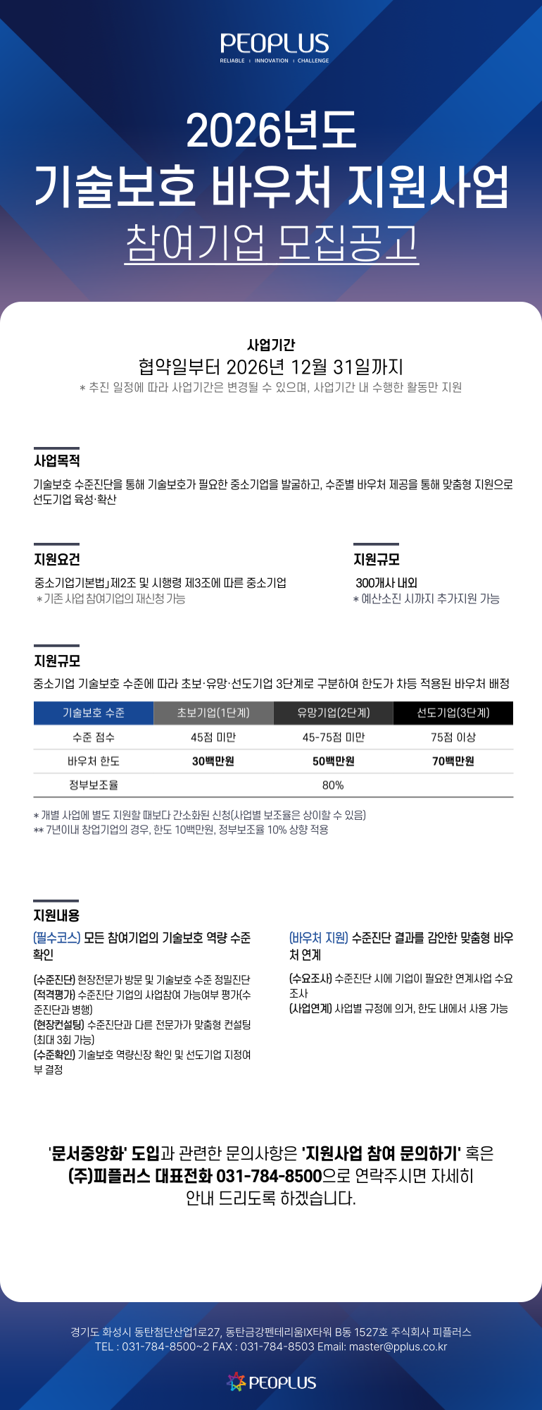 2026 기술보호 바우처 지원 사업 안내 ■ 2026년 기술보호 바우처 지원사업을 신청해 주시기 바랍니다.Thank you for your message. It has been sent.×There was an error trying to send your message. Please try again later.×Submit제품에 대해 궁금한 점이 있으신가요? 빠르고 정확한 답변을 도와드리겠습니다.상담 · 문의하기TEL : 031-784-8500~1 E-mail : sales@pplus.co.kr peoplus2026-03-10T14:30:32+09:003월 10th, 2026|
