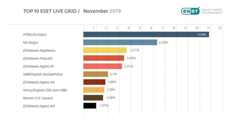 정교한 악성 코드 리포팅 및 추적 시스템인 이셋 라이브그리드(ESET LiveGrid)의 분석에 따르면 11월 가장 많이 탐지된 맬웨어는 전체의 10.08%를 차지한 HTML/ScrInject였습니다.