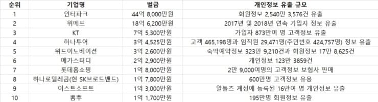 마지막 열 번째는 온라인 커뮤니티 뽐뿌의 1억 1,700만원으로 2015년 발생한 홈페이지 해킹으로 195만명의 회원정보가 유출된 사건입니다. 뽐뿌는 “방통위로부터 개인정보보호를 위한 기술적·관리적 보호조치 의무를 위반했다”며 1억 200만원의 과징금과 1,500만원의 과태료 및 재발방지 대책을 수립·시행하도록 하는 등의 시정명령을 부과 받았습니다.
