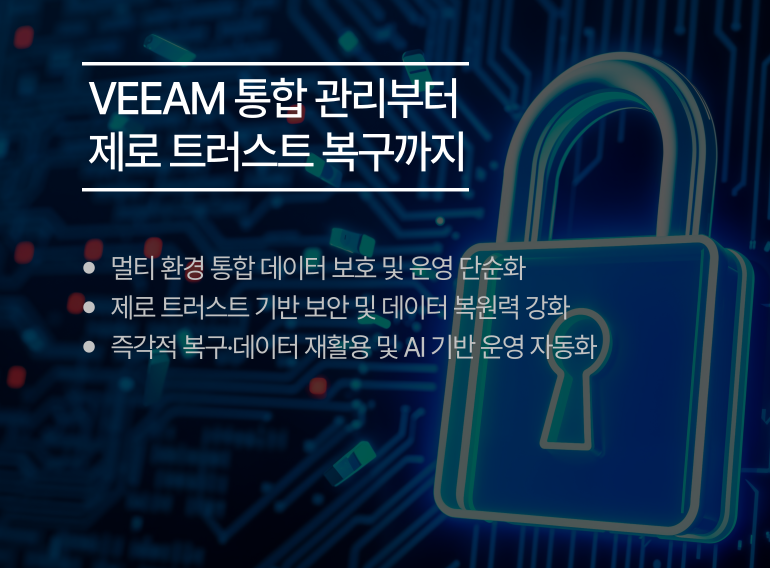 VEEAM 소프트웨어는 단순 백업을 넘어 제로 트러스트 기반의 데이터 레질리언스(복원력) 전략을 제시하며, 클라우드, SaaS, 쿠버네티스 등 모든 환경의 데이터를 단일 플랫폼에서 통합 관리합니다. 특히 랜섬웨어 공격에 대비한 변경 불가능한 백업(Immutability)과 자동화된 복구 검증 기능을 통해 비즈니스 연속성을 보장하며, 국내 대형 게임사 및 글로벌 반도체 기업 등 대규모 환경에서 그 안정성을 검증받았습니다.